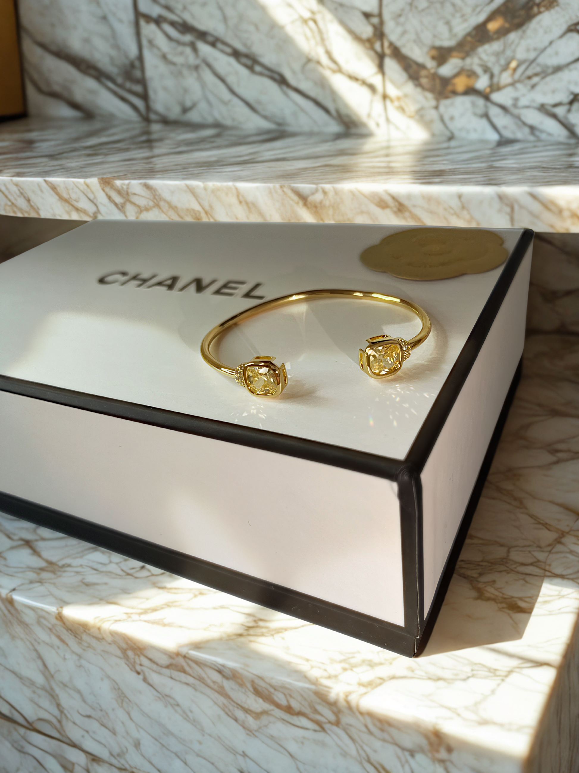 Este bracelete open cuff apresenta duas gemas Fancy Yellow em destaque, criando um contraste luminoso com o brilho impecável do banho de ouro 18k.